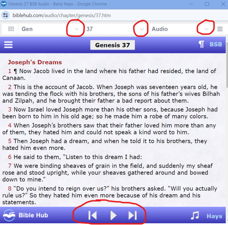 The arrows to the right of each box jumps to different chapters and verses and changes the Audio's voice.